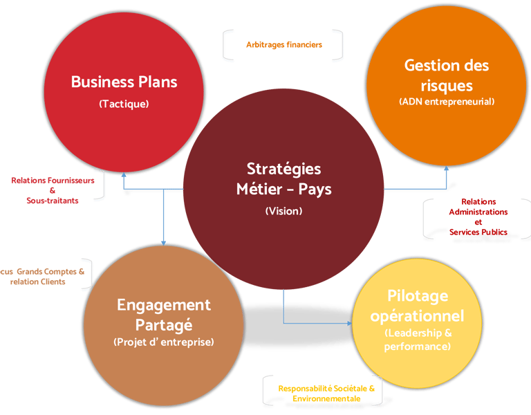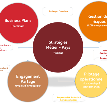 Serge Gurvil allie la rigueur méthodologique des grands groupes internationaux aux savoir faire développés au cours d’années de pratique dans des contextes instables et des situations difficiles le plus souvent – extrêmes parfois. Parce que l‘action est vertueuse et doit primer des solutions d’exécution souples sont préconisées aux clients en complément des études de diagnostic classiques: analyses réalisées dans les sphères de compétences clef ci-dessous, dimensionnées selon leur ordre d’importance pour la vie de l’entreprise.